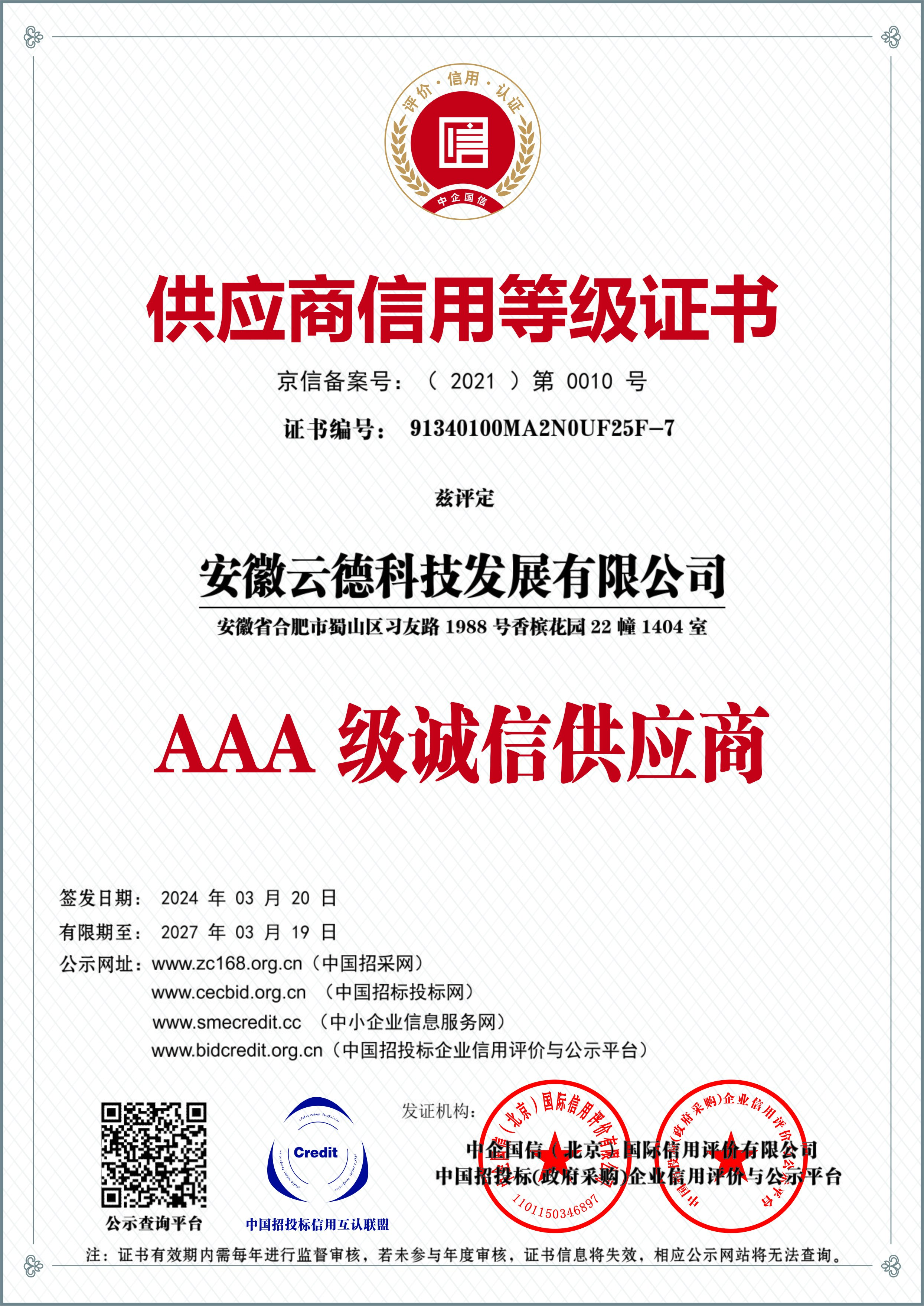 供应商信用等级证书